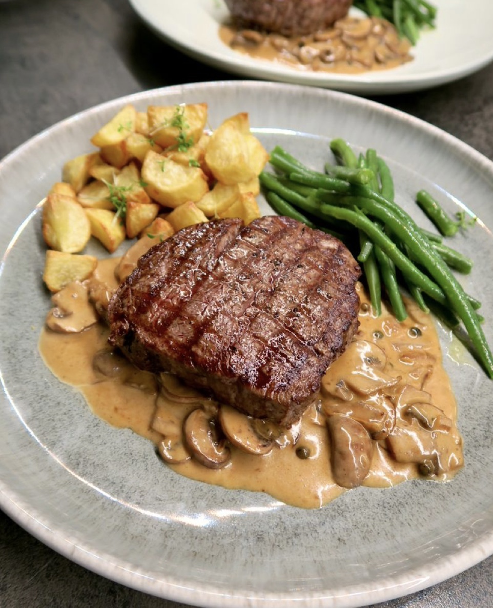 Steak meat, fries, mushroom sauce and beans